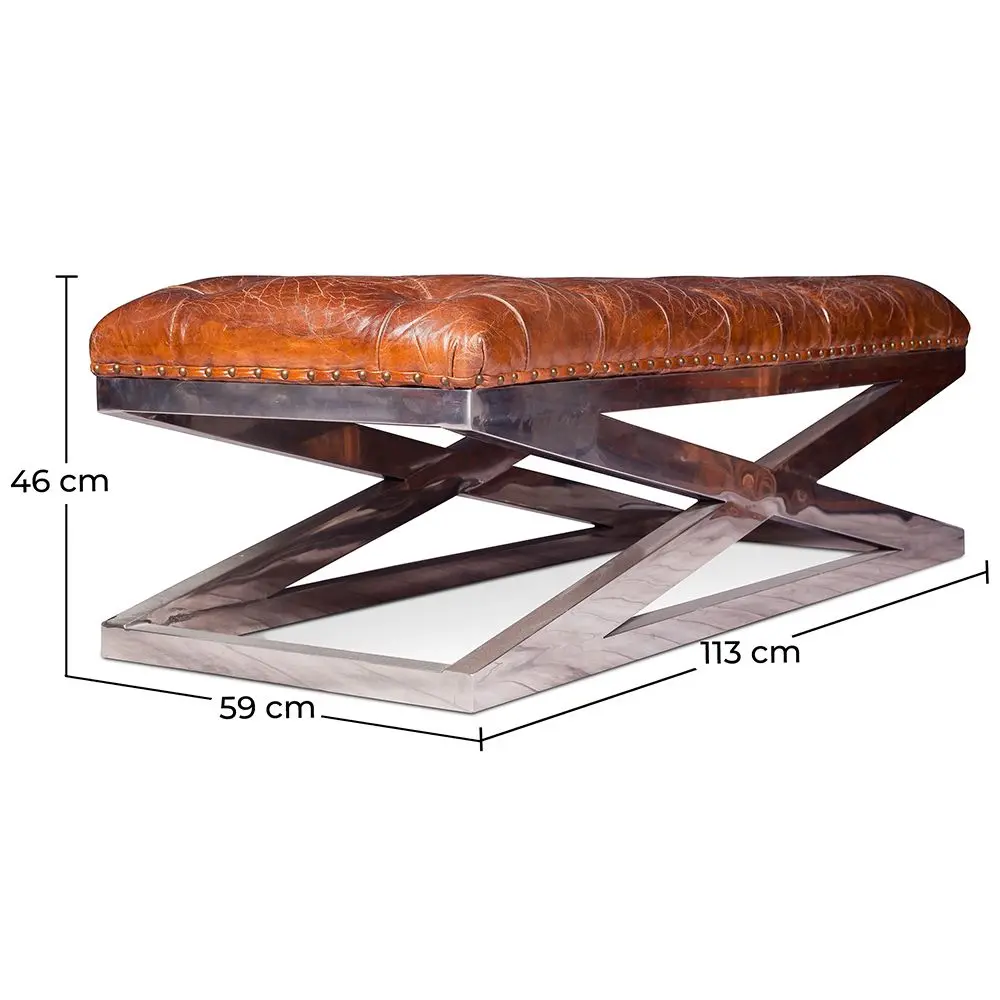 Este Banco acolchoado e em couro castanho da gama Churchill Lounge é sinónimo de elegância e vai ficar perfeito em qualquer espaço, graças sobretudo aos botões e ao seu acabamento cuidadoso. Pode adaptar-se aos ambientes modernos e aos mais tradicionais de igual forma. A sua base é suportada por uma estrutura de aço inoxidável ampla e resistente e a base é feita do mesmo material. Este Banco Vintage foi concebido em pele e tem um enchimento de espuma para lhe oferecer um conforto ideal. O couro também é coberto por pequenos parafusos que lhe dão um apelo prático e estético. A combinação destes dois materiais confere-lhe uma estética única, uma combinação de encanto e robustez.