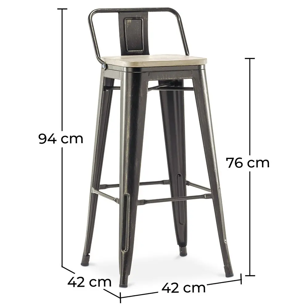 Transforme seu bar ou cozinha em um espaço acolhedor e cheio de caráter com o banco Metalix com encosto e assento de madeira.