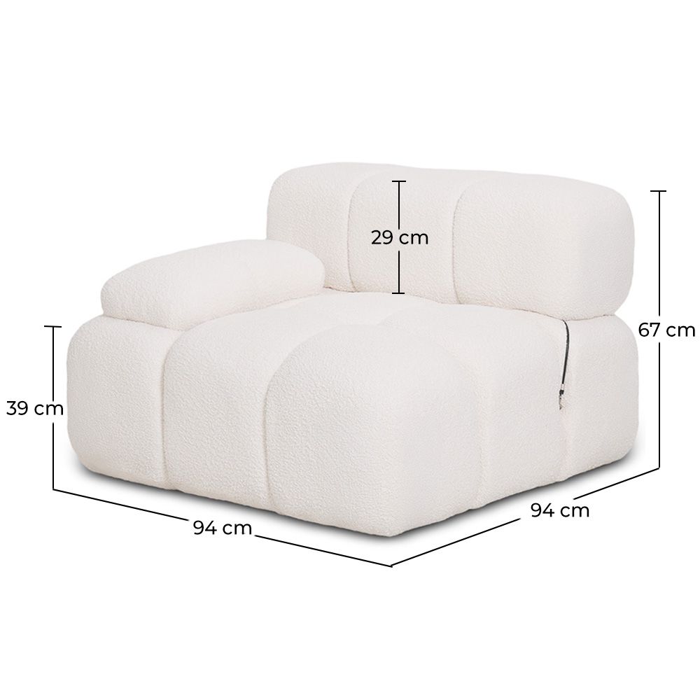 Dê à sua sala de estar um toque contemporâneo e acolhedor com este sofá de canto modular estofado em tecido bouclé branco creme. Seu design versátil permite combiná-lo com outros módulos para criar diferentes configurações, adaptando-se a espaços grandes ou pequenos de acordo com suas necessidades.