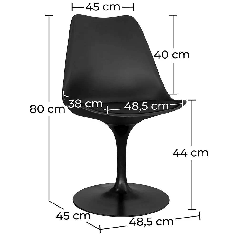 Apresentamos-lhe a mítica cadeira Tulipa preta numa versão mais económica, embora com a mesma qualidade. Esta cadeira giratória é fabricada com um assento de PP e uma perna de aço maciço pintada em preto. A almofada é estofada em pele sintética e a sua espuma macia proporciona um grande conforto. A resistente cadeira Tulipa em preto mate vai ficar ótima em qualquer estilo de sala de jantar.