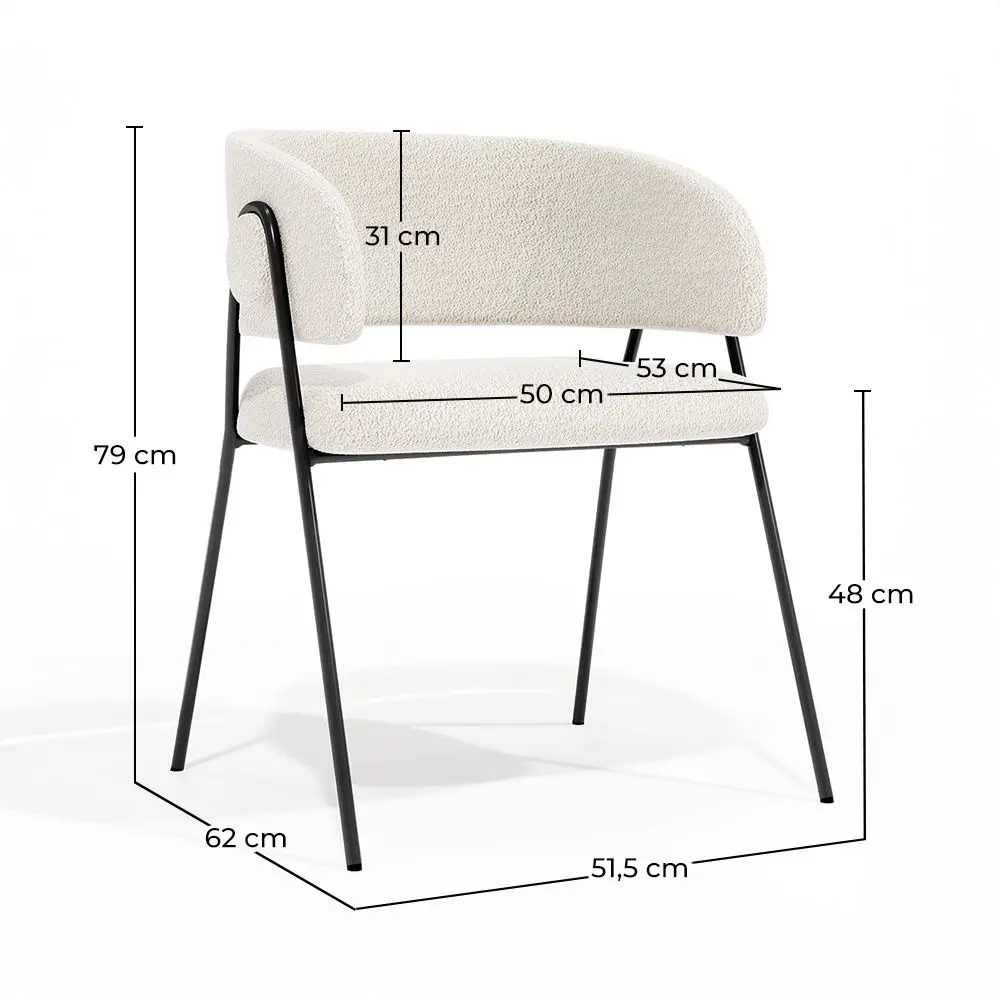 A combinação do estofamento bouclé e pernas de metal preto cria uma estética equilibrada e harmoniosa. A nossa cadeira Manar adapta-se a uma variedade de estilos decorativos, desde contemporâneo até clássico, e torna-se o ponto focal de qualquer sala de jantar. As pernas de metal num tom suave e sofisticado de champanhe trazem uma aparência moderna e refinada. O metal é conhecido pela sua resistência e durabilidade, garantindo uma cadeira robusta e resistente que pode suportar o uso diário sem perder o seu encanto. O estofamento bouclé adiciona um toque de textura e suavidade, criando uma experiência visual e tátil única. As delicadas e entrelaçadas alças do tecido bouclé proporcionam uma sensação luxuosa e agradável ao sentar, transformando cada refeição num momento de conforto e relaxamento.