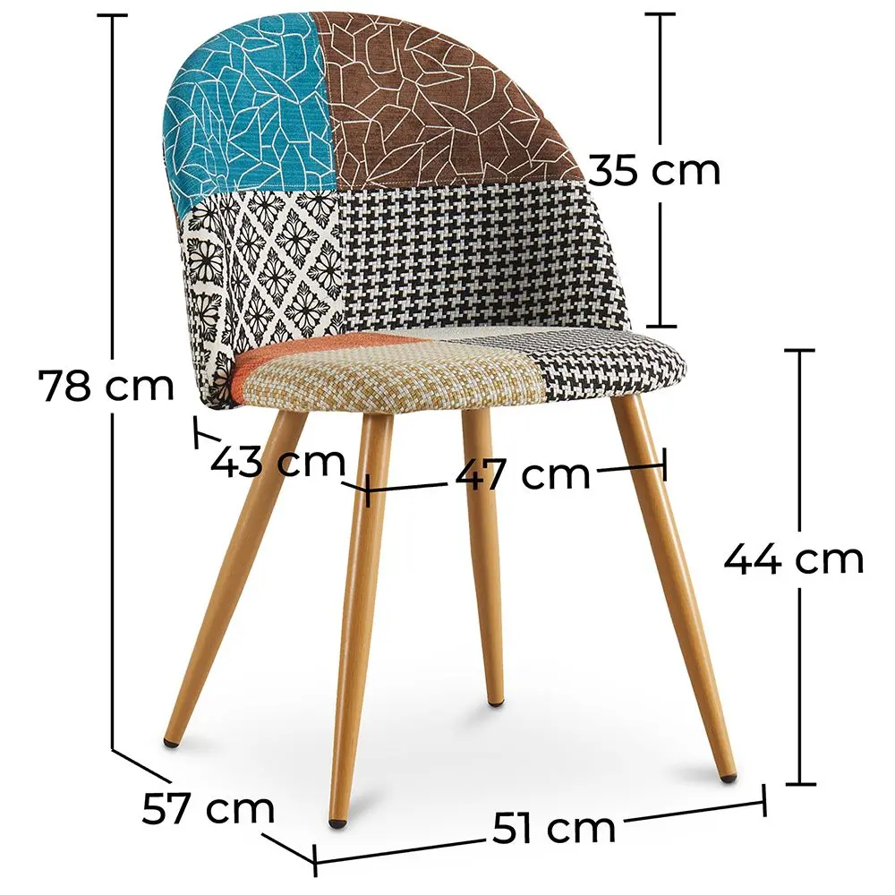 A comodidade proporcionada ao sentar é crucial para tornar uma cadeira de jantar memorável, seja num hotel, restaurante, ou em casa. Esta cadeira de cozinha é feita com uma armação metálica com aspeto de madeira e é estofada com tecido patchwork.
