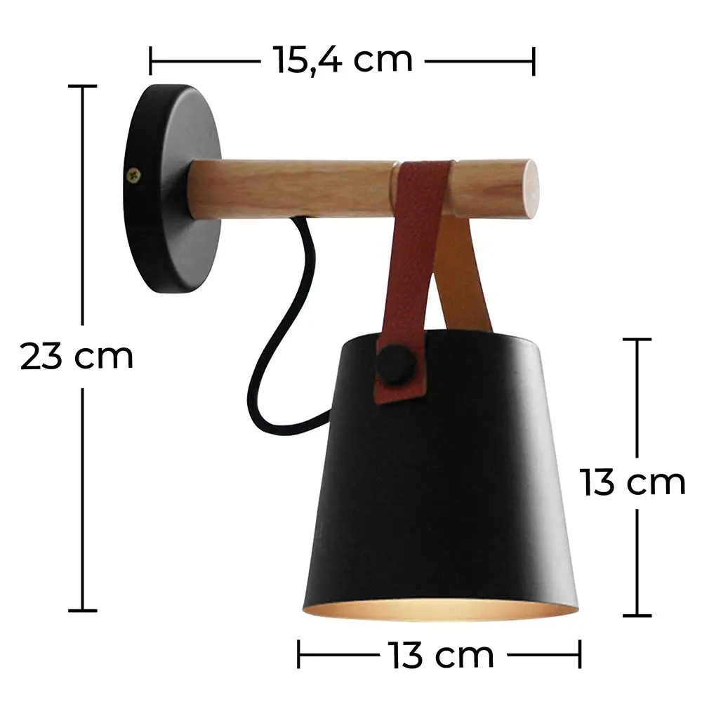 Este candeeiro de parede moderno com toque vintage combina perfeitamente o metal com a madeira e o couro castanho.