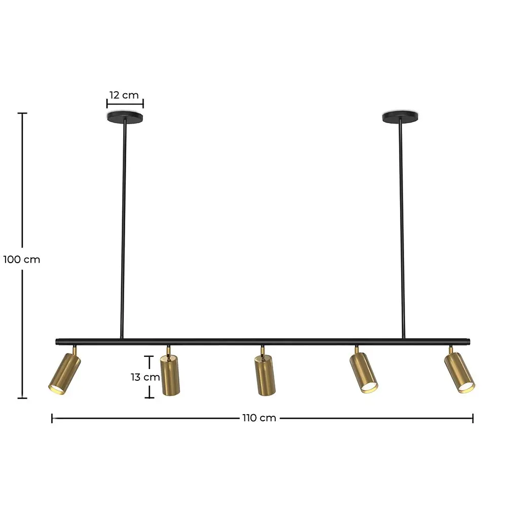 O candeeiro de teto rail Lark com 5 focos dourados ajustáveis é um candeeiro de design de qualidade superior, ideal para utilização em hotéis, restaurantes e cafés. Este candeeiro suspenso de estilo industrial moderno tem um comprimento de 110 centímetros e os focos ajustáveis permitem ajustar a posição da luz para criar o ambiente perfeito na sua sala.