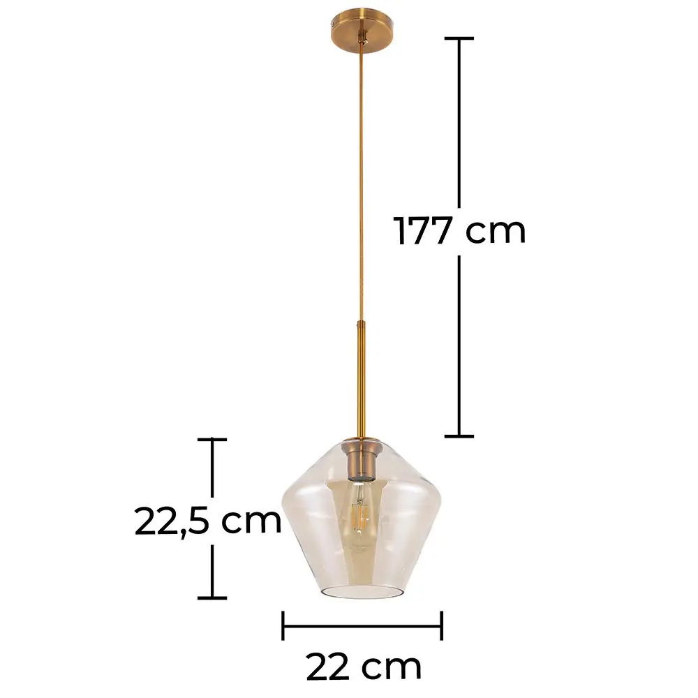 O abajur de vidro, disponível em diversas cores, tem 23 cm de diâmetro e uma altura de 21,5 cm. Este candeeiro de design ajustável tem um tubo de metal que pode ser aumentado ou diminuído de acordo com a altura do seu teto. O suporte para lâmpadas, base de suspensão e o gancho são todos criados com metal pintado a ouro.
