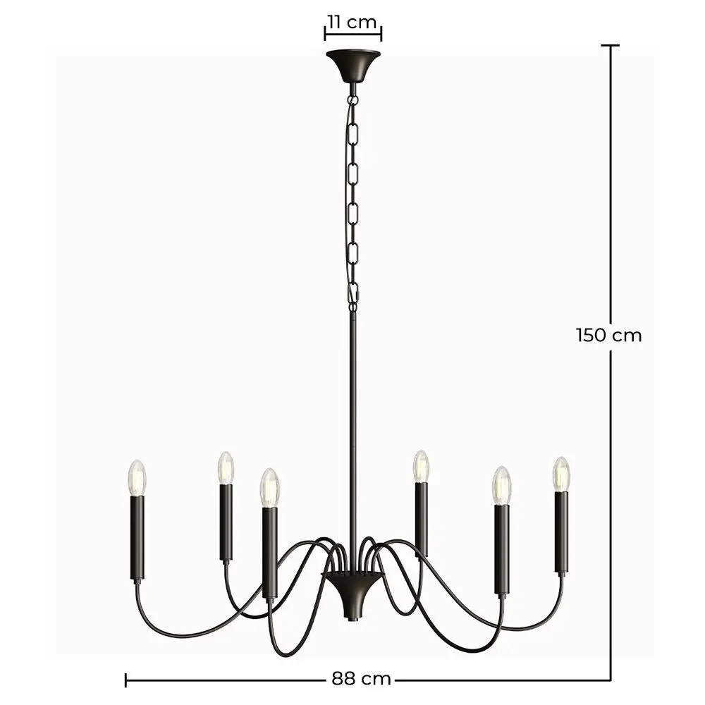 Dê um toque elegante e contemporâneo a qualquer espaço com este candeeiro suspenso em metal preto mate, inspirado no design clássico dos lustres. Com seis braços curvos, esta luminária combina a estética tradicional com um estilo moderno e minimalista, ideal para salas de jantar, salas de estar, entradas ou espaços com tetos altos.
