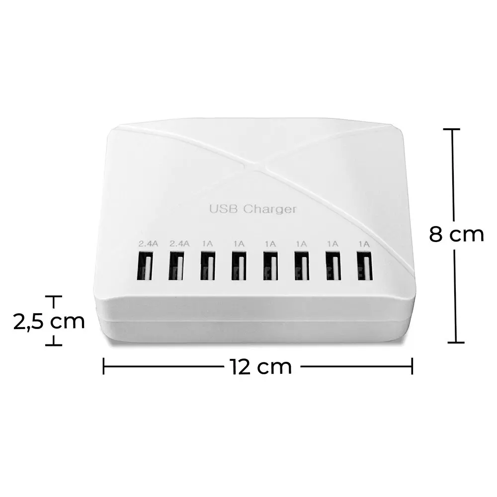 Pode carregar até 8 dispositivos ao mesmo tempo pois o carregador tem 8 portas USB individuais.