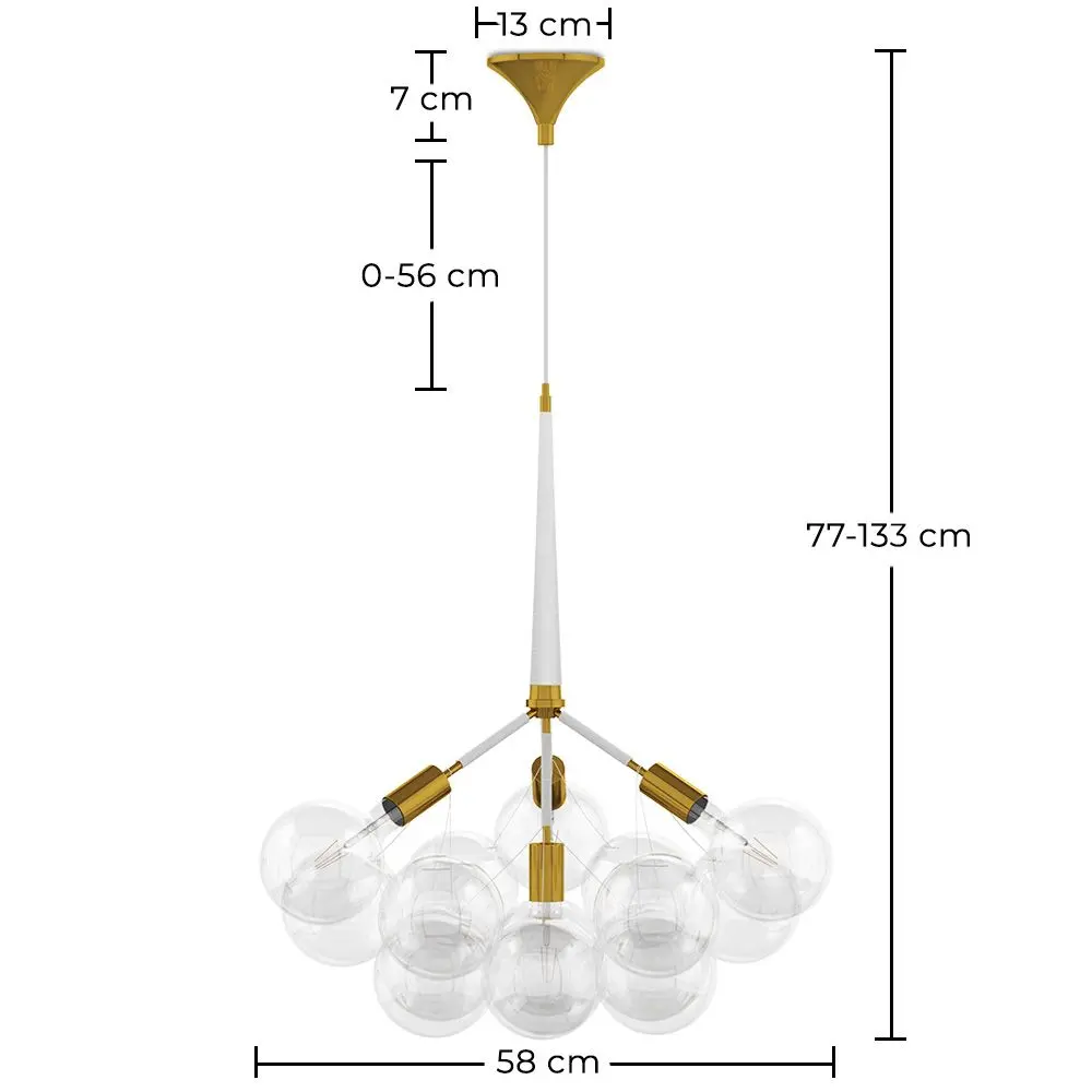 Este moderno candeeiro suspenso não só proporciona a iluminação perfeita, mas é também um ícone do design de interiores. O seu design com 4 lâmpadas e 12 globos de vidro faz deste candeeiro de teto um objeto decorativo ideal para hotéis, restaurantes ou cafés que queiram doar à sua decoração um aspeto vanguardista e luxuoso.