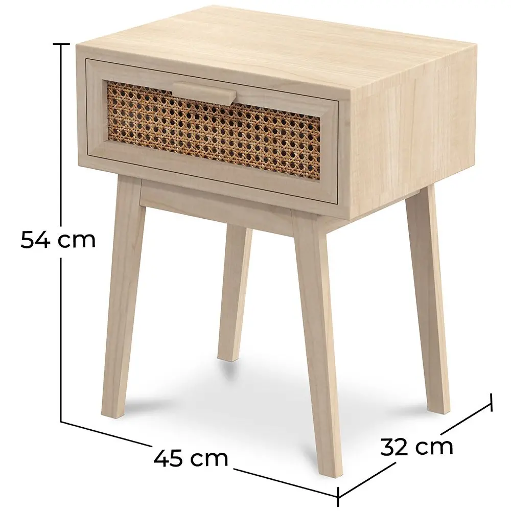 Esta mesa de cabeceira de design é ideal para os quartos da sua casa ou para hotéis. Tenha à mão os seus objetos pessoais, tais como o seu telecomando, eBook ou telemóvel, graças ao espaço de armazenamento proporcionado pela gaveta com frente em palhinha, que se abre e fecha suavemente graças às dobradiças de qualidade premium. O rattan com design cannage e a cor natural da madeira desta mesa de cabeceira combinam perfeitamente com qualquer estilo de decoração. O design cannage é típico do estilo boho chic e dará um toque único ao seu quarto.