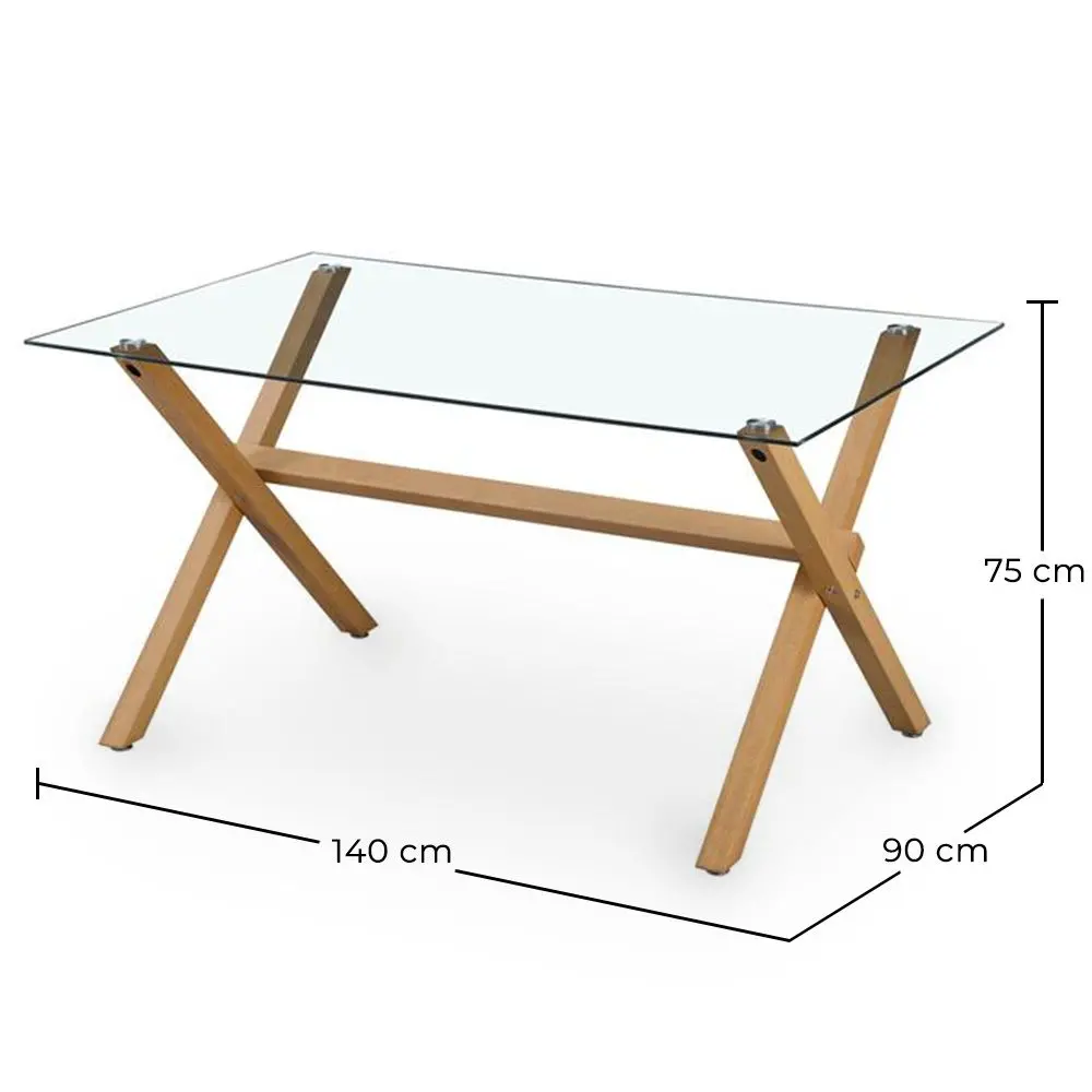 Renove a sua sala de jantar com esta mesa de jantar retangular em vidro temperado, que combina perfeitamente design e funcionalidade. Com 140 cm de largura, 90 cm de profundidade e 75 cm de altura, é ideal para 6 pessoas. Os pés de metal com acabamento que imita madeira oferecem estabilidade e um toque acolhedor, inspirado no estilo escandinavo. O seu design elegante e moderno torna-a uma opção versátil para espaços minimalistas, elevando a estética da sua sala de jantar com simplicidade e estilo.