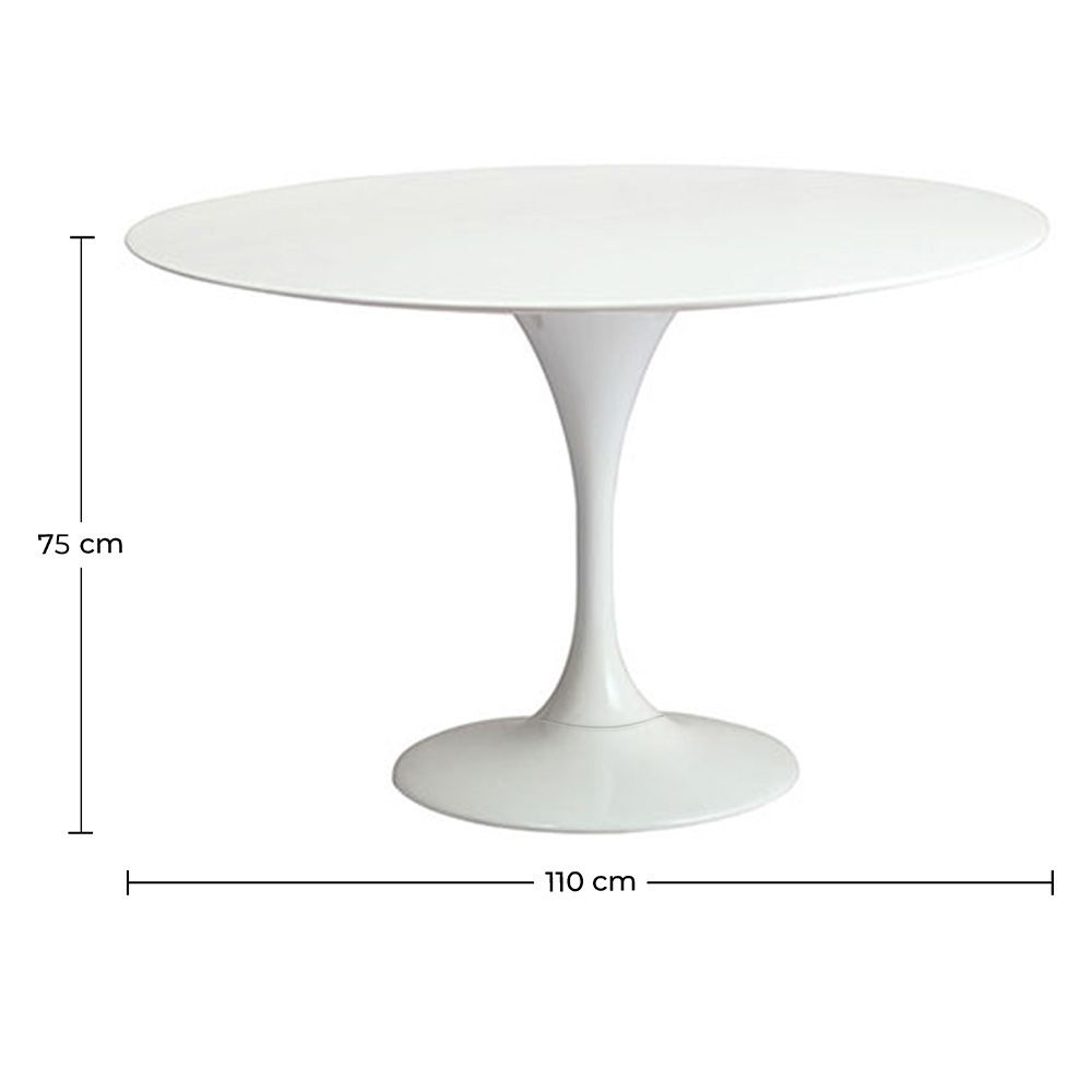 Mesa Redonda Tulipa de Fibra de Vidro - 110 cm. A Mesa Tulipa redonda feita em fibra de vidro faz parte da coleção "Pedestal" juntamente com a cadeira e a poltrona Tulipa . "As pernas clássicas das cadeiras e mesas tornam-nas muito práticas e dão à sala de estar uma aparência desordenada", explicava Saarinen. "Queria libertar todo esse espaço ocupado pelas pernas na casa". Tal como a flor da qual obtém o nome, esta Mesa Tulipa redonda em mármore tem linhas delicadas e elegantes. Além de ser prática, vai melhorar a aparência da sua sala de jantar.