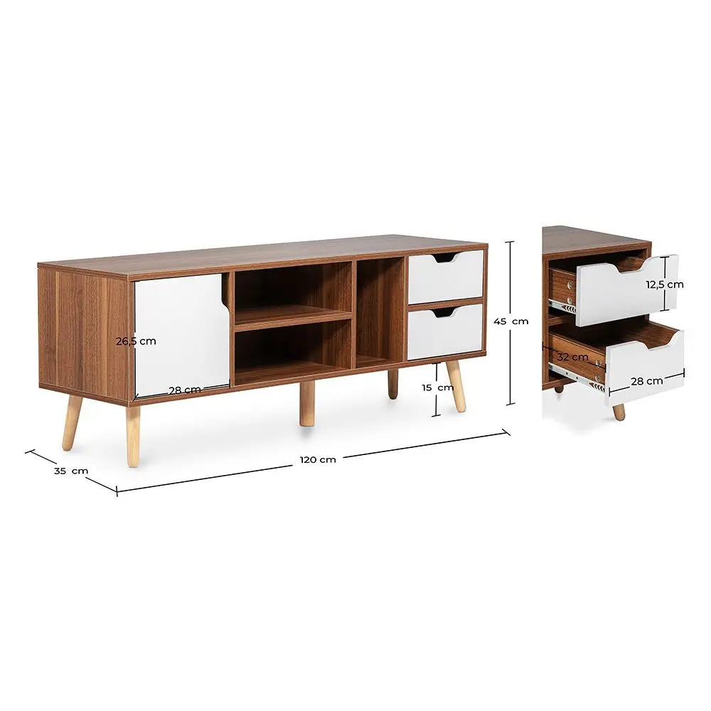Este TV mueble de estilo escandinavo é a peça de mobiliário perfeita para criar uma atmosfera acolhedora e tranquila na sua casa. Com várias gavetas e nichos de arrumação, este aparador com dois tons de madeira é exatamente o que precisa para o ajudar a organizar a sua casa. Estável, robusto e com um design vintage, o nosso TV mueble Lal tem todos os detalhes de que necessita.