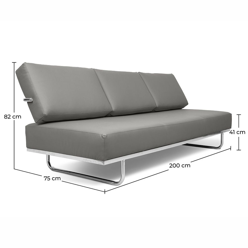 A combinação perfeita entre aspeto e funcionalidade! O Sofá Cama SQUAR , concebido em 1934, é um sofá de 3 assentos que pode ser transformado numa cama com um bom gosto incrível. O elegante design retro e a sua estrutura leve e sofisticada refletem a alta tecnologia da altura, o que faz com que esta peça de design tenha uma grande procura até hoje. É composto por uma estrutura de aço inoxidável e tem uma cobertura em imitação de couro. Este design moderno é prático e esteticamente atraente. Perfeito para as suas visitas, vai ficar encantado com o seu design e conforto. Depois de o experimentar, vai ter tudo pronto para relaxar.