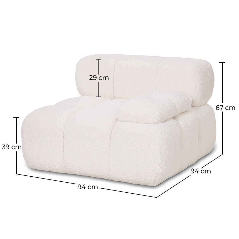 Dê à sua sala de estar um toque contemporâneo e acolhedor com este sofá de canto modular estofado em tecido bouclé branco. Seu design versátil permite combiná-lo com outros módulos para criar diferentes configurações, adaptando-se a espaços grandes ou pequenos de acordo com suas necessidades.